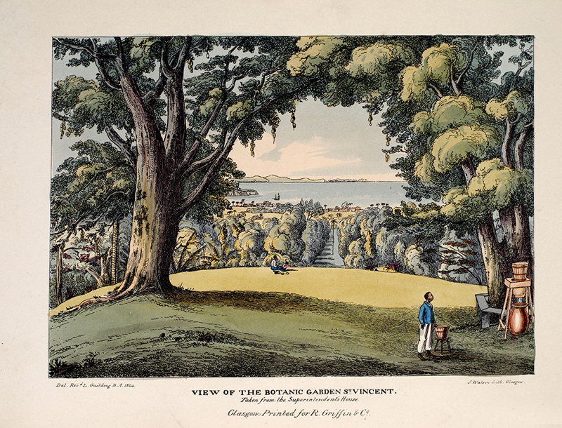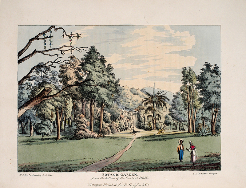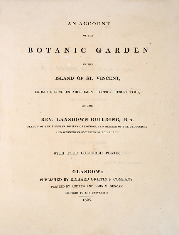 The meticulous account of the Botanic Garden, with charming lithographic views. Guilding was a Fellow of the Linnaean Society of London and a Member of Edinburgh's Geological and Wernerian Societies.
